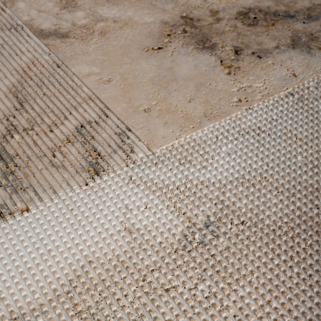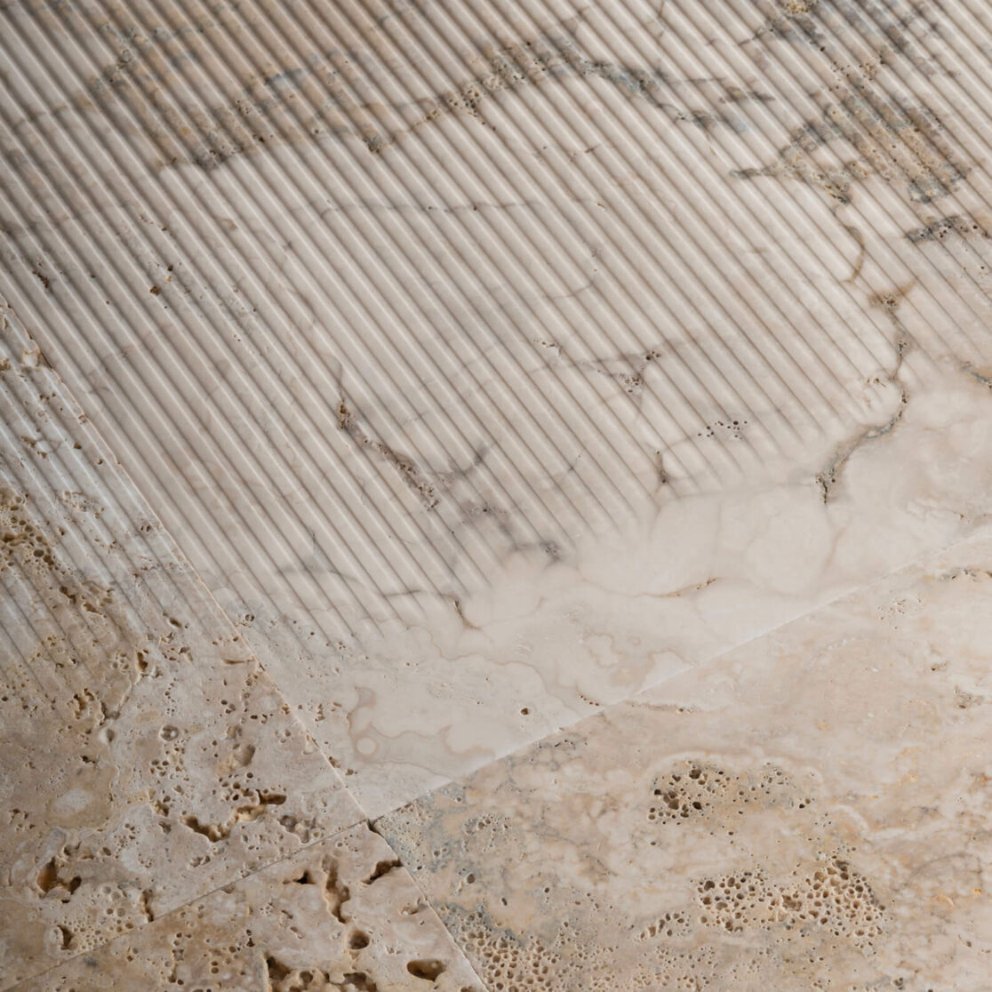 Solchi scavati nella materia, canali che definiscono immagini e scandiscono ritmi tra le venature sinuose della pietra. Le ombre che sfumano delicatamente ingannano le fughe del rivestimento e richiamano atmosfere classiche, suggerite da fitte scanalature che si rincorrono tra le lastre. Sfumato è un rivestimento che genera disegni complessi attraverso l’uso di poche mattonelle incise: una mattonella liscia, una rigata e una che sfuma dal piano al rigato, dalla quale prende il nome la collezione; completa la gamma la mattonella quadrettata, capace di portare soluzioni ulteriori e maggiore movimento alla composizione, aprendo le strade ad incroci e nuove direzioni.